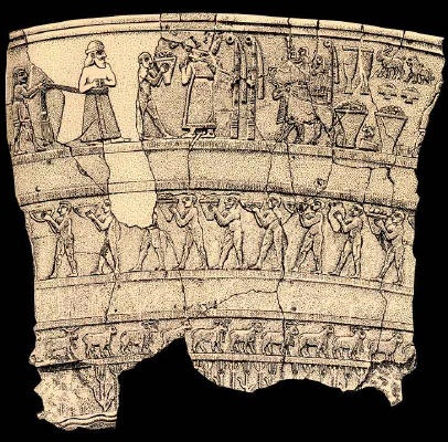 Máximo representante del relieve ceremonial, fue realizado durante la primera fase de desarrollo de la cultura sumeria. Como se puede apreciar en la imagen vemos un gran vaso de alabastro de casi un metro de altura, destinado a funciones de culto. Con este vaso se inicia un nuevo modo de representación que sería característico de la plástica sumeria; se trata de una disposición de bajorrelieves en escenas dispuestas en bandas. Empezando por abajo, podemos observar en el registro inferior una línea sinuosa representando el medio natural con agua, plantas y animales del entorno. En el siguiente registro se representa al hombre con el modelo típico sumerio: cuerpo rechoncho y musculoso, estos hombres van en procesión como oferentes portando regalos a la diosa Innana. Su desnudez se relaciona con la idea de fertilidad. En el último registro, el superior, encontramos una escena ritual de nuevo vinculada a la fecundidad, se representa la ceremonia de la hierogamia o bodas sagradas entre el jefe de la comunidad y la representante de la diosa.