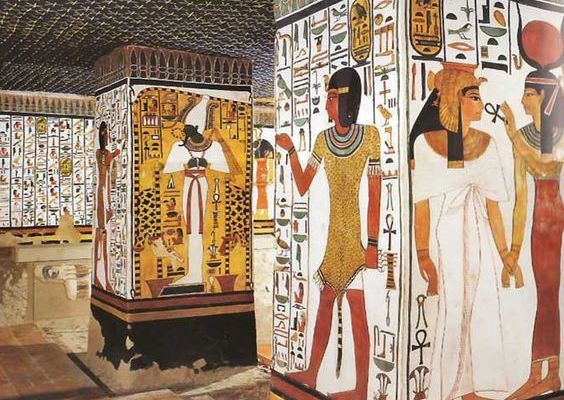 La tumba de Najt, que vemos en la imagen, nos muestra una bellísima escena de música y danza de la mano de jóvenes intérpretes femeninas que amenizaban los banquetes de la nobleza. Pero además de esta composición también podemos citar las pinturas ubicadas en la tumba de Ramose, con una escena fúnebre en la que participan plañideras de largas cabelleras rizadas, la cual tiene una fama universal. Por otra parte están las pinturas de la tumba de Userhet, donde este participa en una escena de caza en el desierto desde su carro; la tumba de Menna, en la que se representa con gran detallismo al dueño del enterramiento y a su familia participando en los antiguos y populares deportes reales de la caza y de la pesca en los pantanos.
